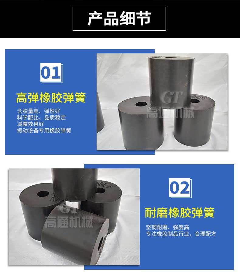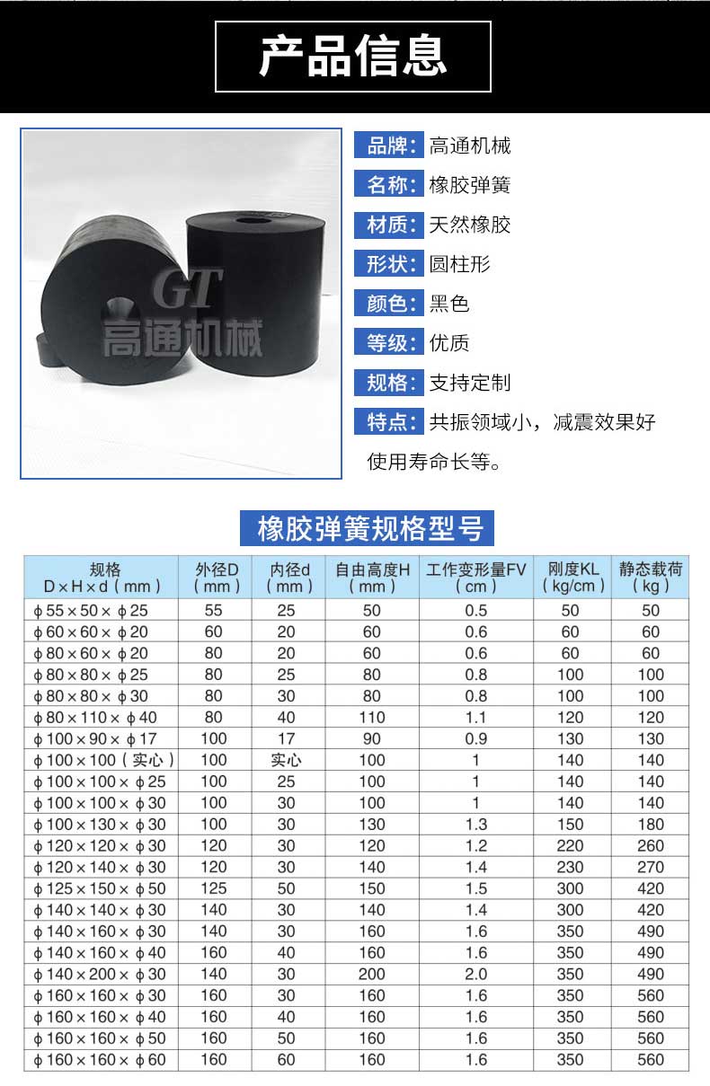 橡膠彈簧:是一種高彈性體,制作材料有普通橡膠。橡膠彈簧彈性模量小,受載后有較大的彈性變形,借以吸收沖擊和振動。它能同時受多向載荷,但耐高溫性和耐油性比鋼彈簧差。如有特殊要求可用耐油橡膠制成。該產(chǎn)品減振效果好,共振領(lǐng)域小,使用壽命長,成本低,還有良好的耐寒性,優(yōu)良的氣密性,防水性,電絕緣性,是減振的最佳選擇。
